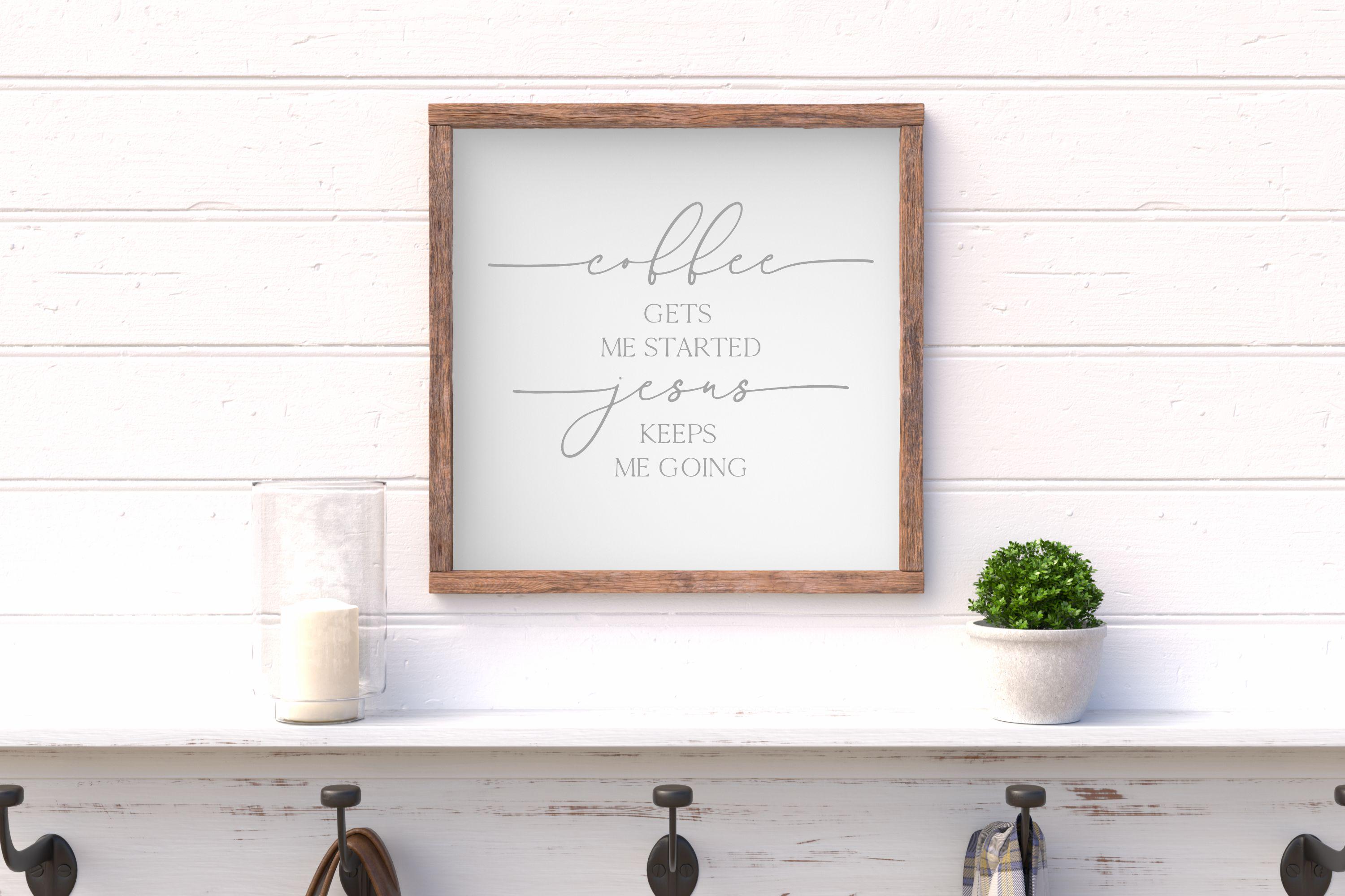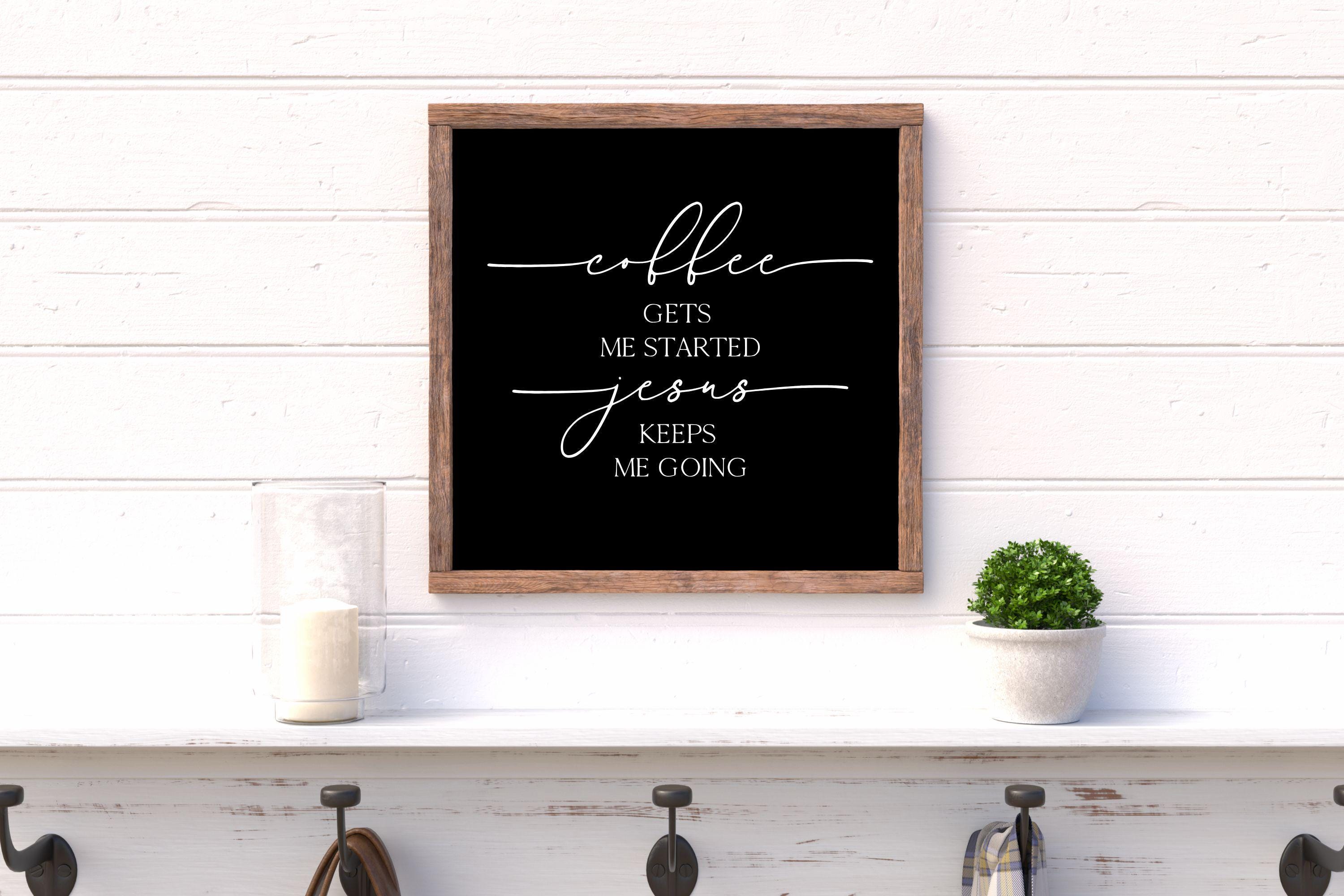 "Coffee Gets Me Started Jesus Keeps Me Going" Framed Wood Sign